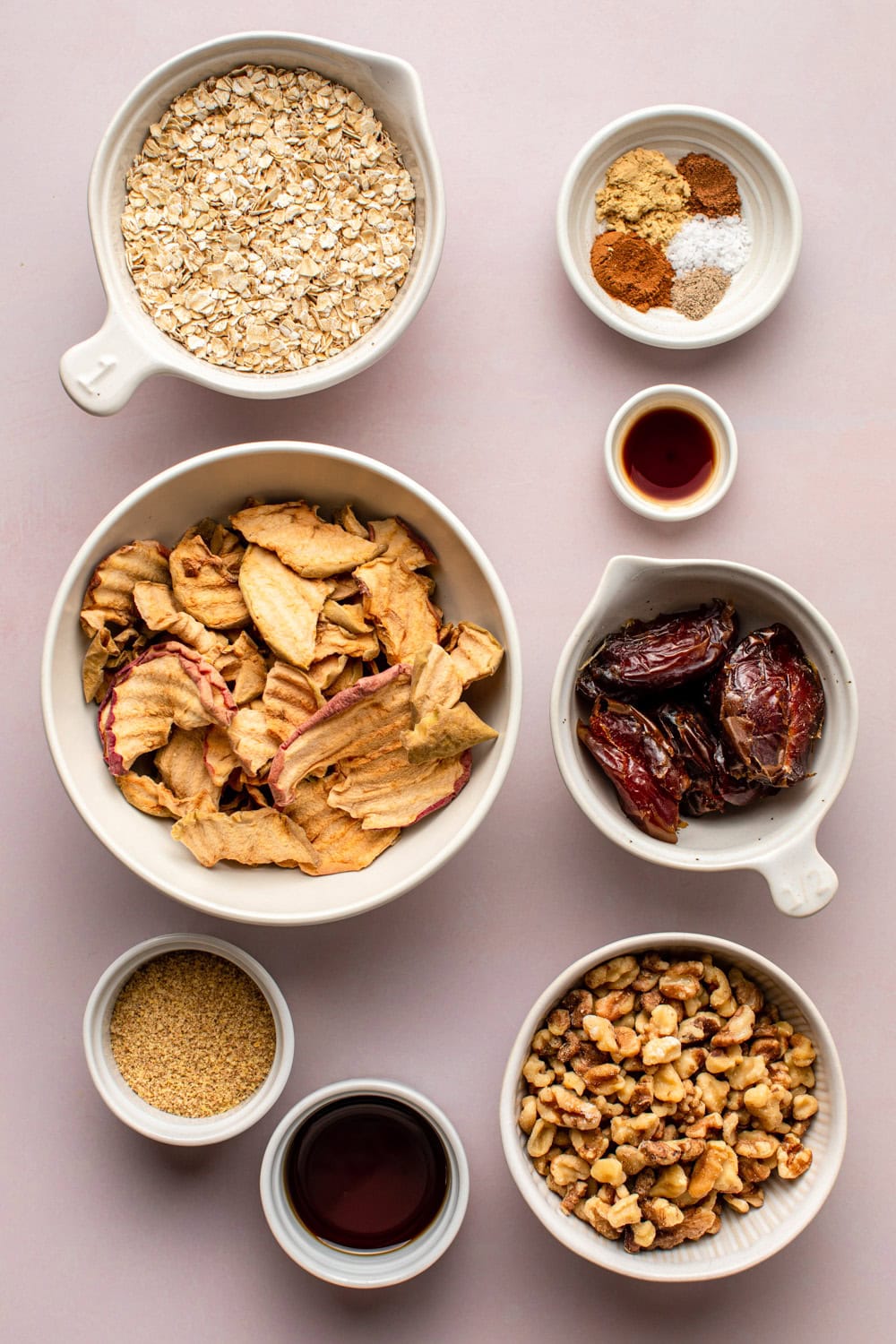 - Meanwhile, pulse the oats, apple chips, walnuts, ground flax, spices, and salt together in a food processor until a coarse flour forms.