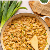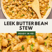 This Vegan Leek and Butter Bean Stew is a one-pot comfort food that will instantly warm you up! It simmers sautéed leeks, canned white beans, and aromatics in vegetable broth – transforming into a cold-weather staple in less than 1 hour. Scoop up every bite with some crusty bread, and there you have it: the meal to curl up with on a crisp chilly day.