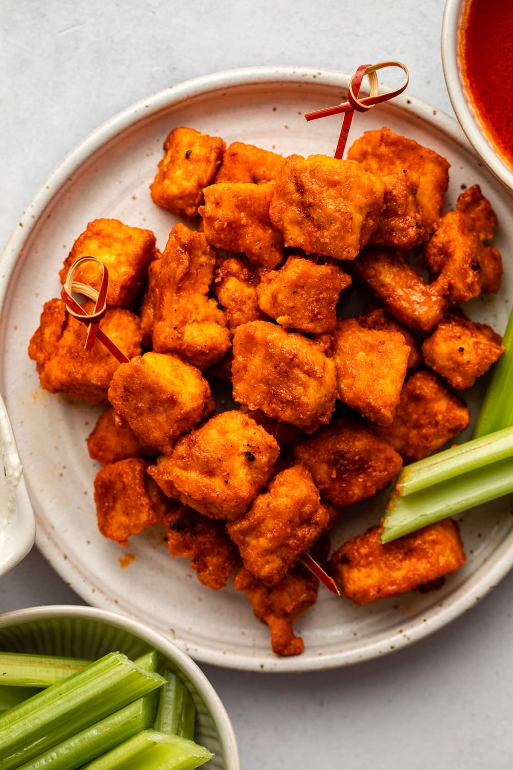 Serve these Buffalo Tofu Wings fresh out of the oven with a side of celery and vegan ranch dressing or blue cheese dressing for the ultimate game day snack. I also like to make skewers with 1-2 pieces of buffalo tofu and a piece of celery for an easy-to-eat appetizer! Dunked in ranch, of course 😉