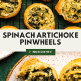 These Spinach & Artichoke Puff Pastry Pinwheels are the perfect appetizer when you’re in need of something that requires minimal effort with big payoff. It’s creamy, cheesy, and stuffed with real spinach and artichoke for an appetizer to remember. All you need is 7 simple ingredients!