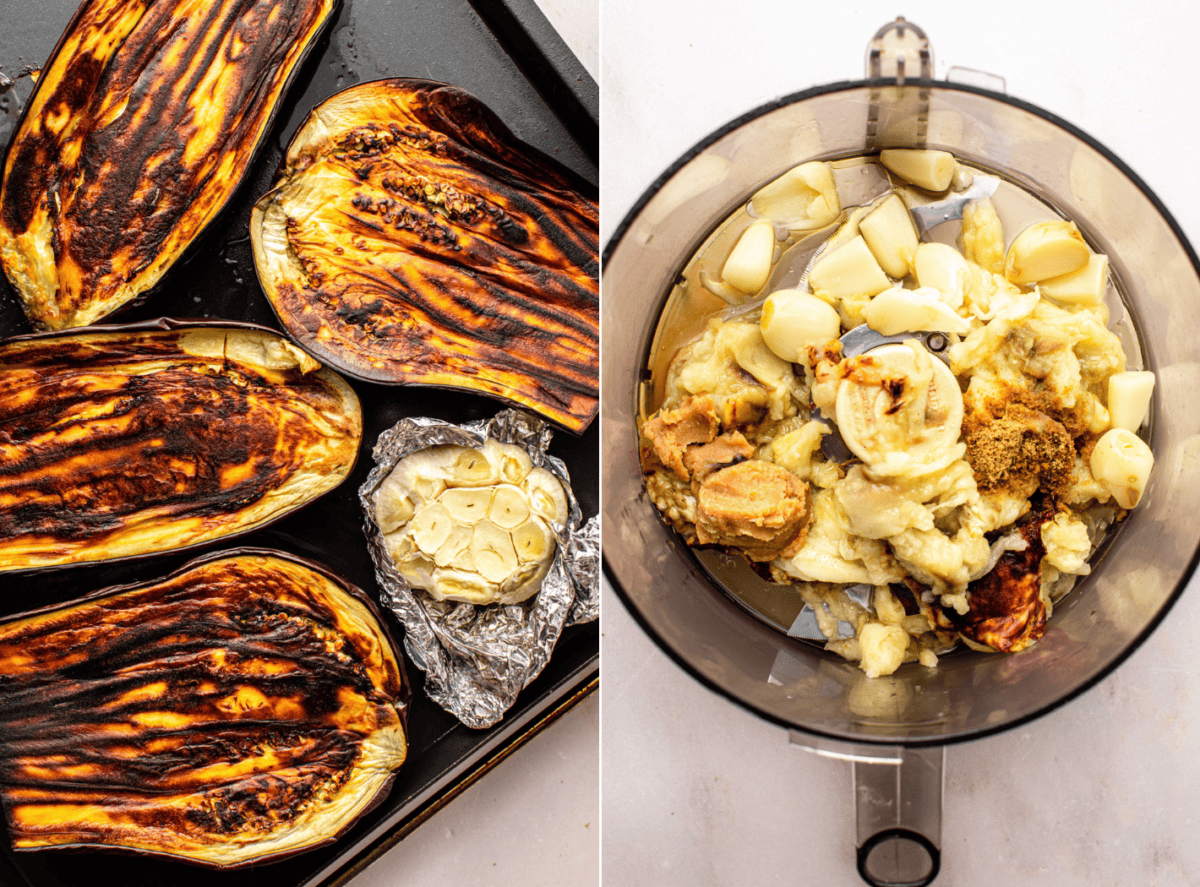 - Scoop the eggplant flesh of one roasted eggplant into the bowl of a food processor along with the remaining ingredients and process until smooth.