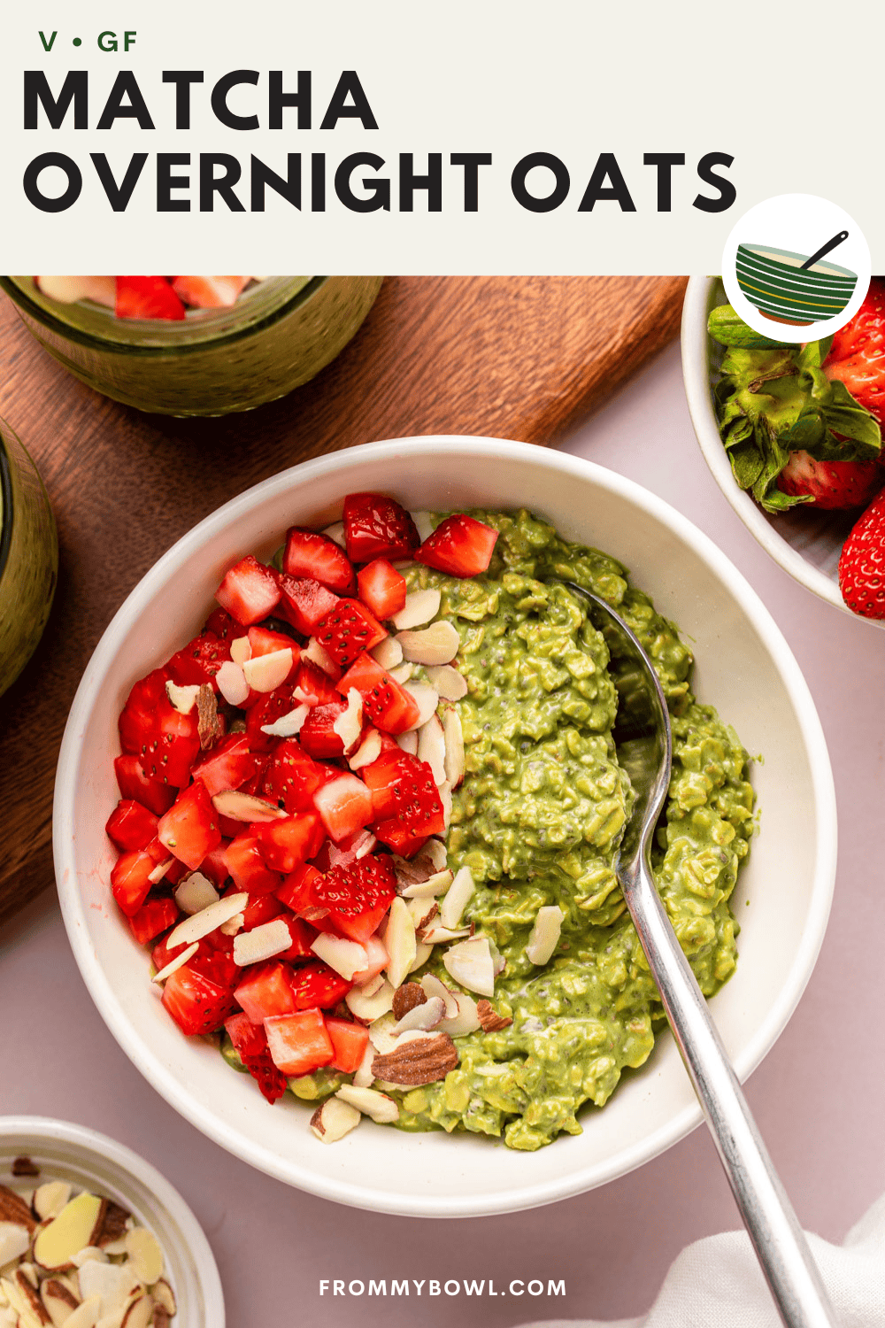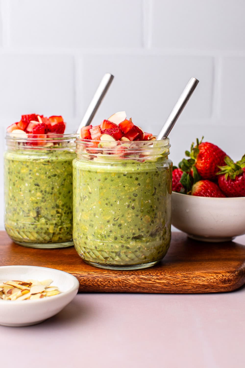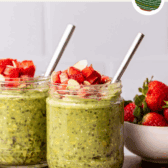 I love having a few jars of matcha overnight oats ready to go in my fridge. They’re always a delicious and filling breakfast or snack I can enjoy when I’m running late, or I can top the jar with toppings when I have some extra time. Chopped strawberries are one of my favorite toppings, but raspberries, blueberries, sliced bananas, shredded coconut, a drizzle of nut butter, hemp seeds, chopped nuts, a dollop of vegan whipped cream, or granola are also fantastic.