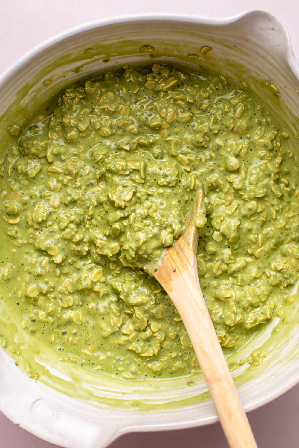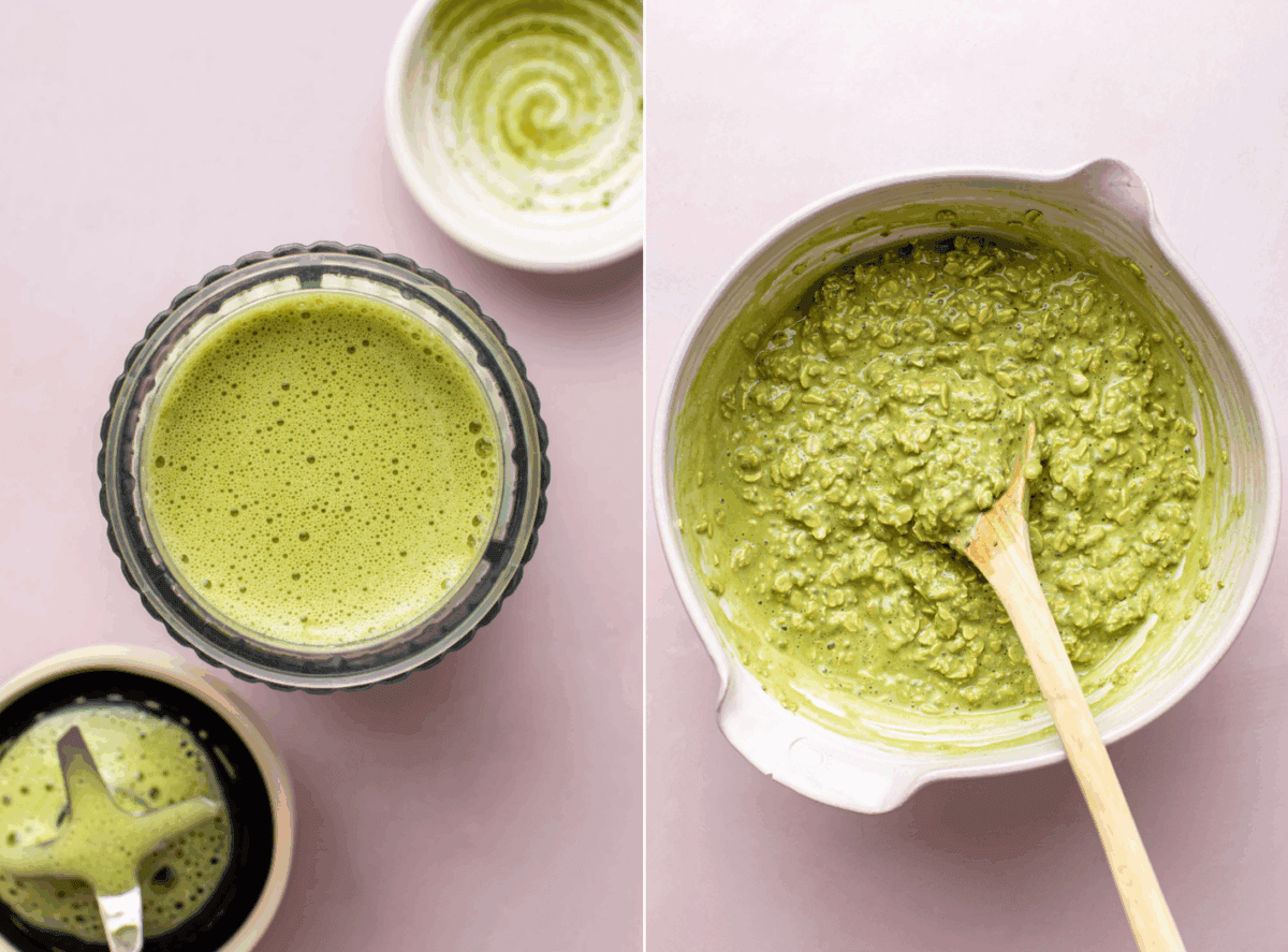 - Pour the matcha milk over the dry ingredients, then stir in the yogurt. Sit for 5 minutes, then stir again. Set it aside for another 5 minutes.