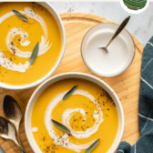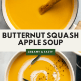 This 35-Minute Butternut Squash Soup is made with creamy squash, tart Granny Smith apple, and herbaceous rosemary and sage for a creamy soup bursting with fall flavor. Vegan, Gluten-Free, Oil-Free option.