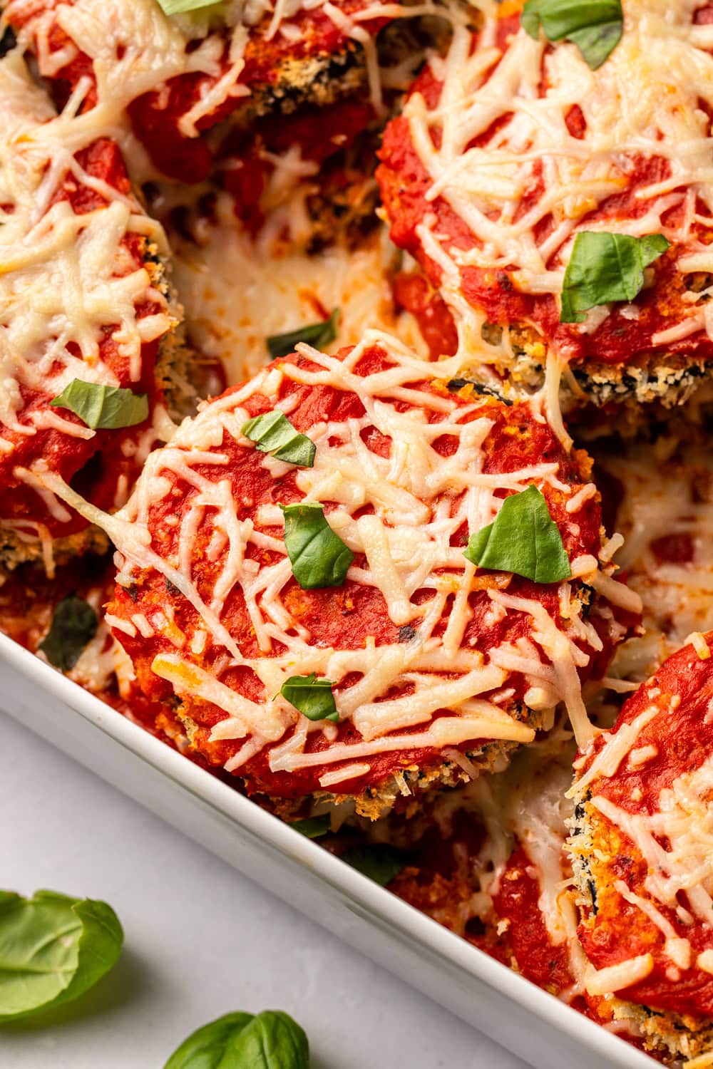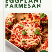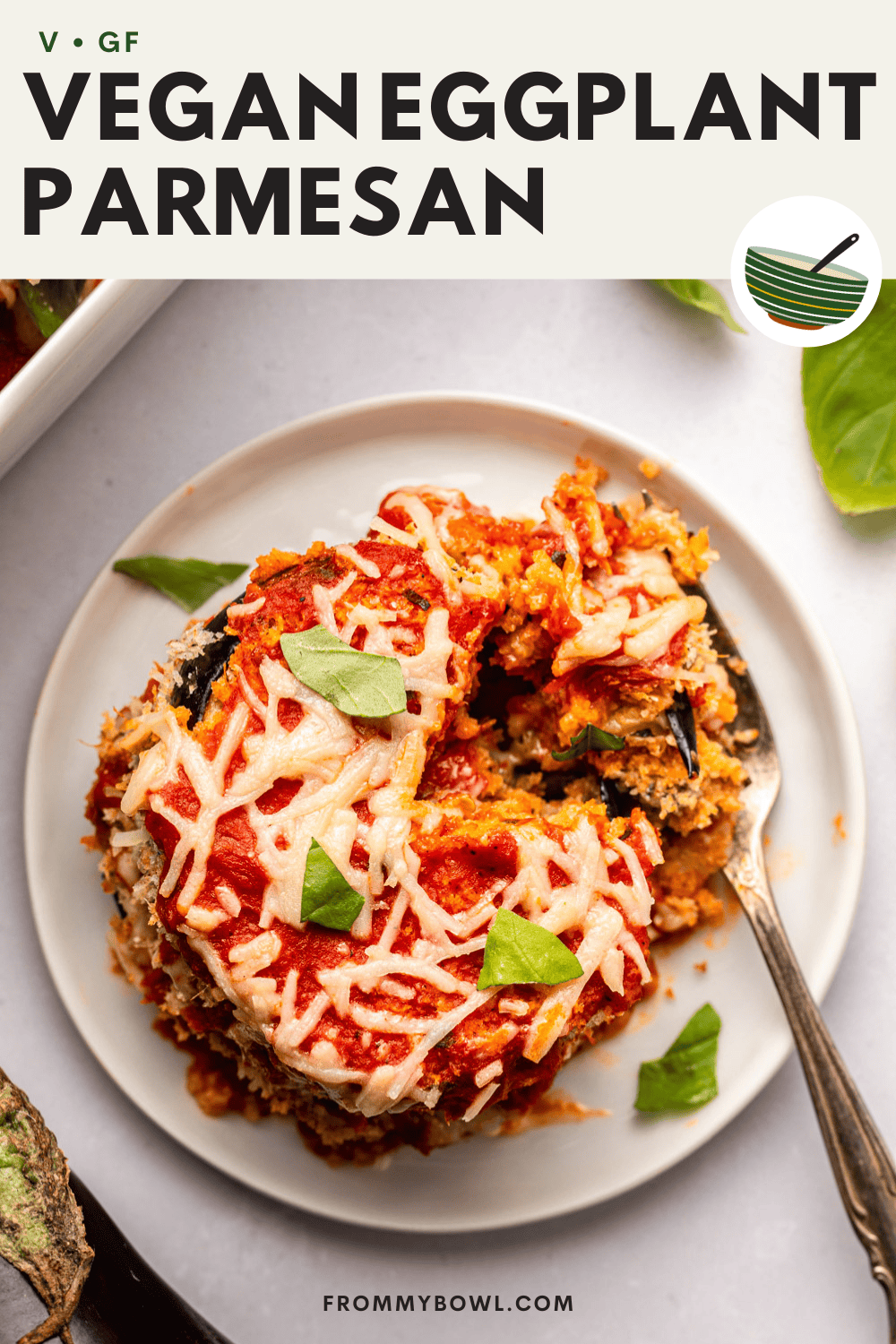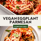 Sunday dinners call for this Vegan Eggplant Parmesan. The layers of crispy Italian-seasoned eggplant slices, melted cheese, and marinara sauce are so comforting and perfect for serving over pasta. Vegan, Gluten-Free Option.