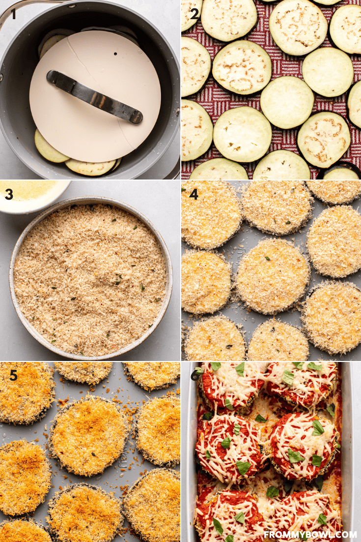 - Don’t skip salting the eggplant. Let’s face it… Eggplant is bitter, and we need to remove that flavor in order to make our eggplant parm the tastiest. Brining the slices in a salt water solution will draw out aaaaall of that bitterness and excess moisture, helping the slices taste their best and bake up nice and crispy.