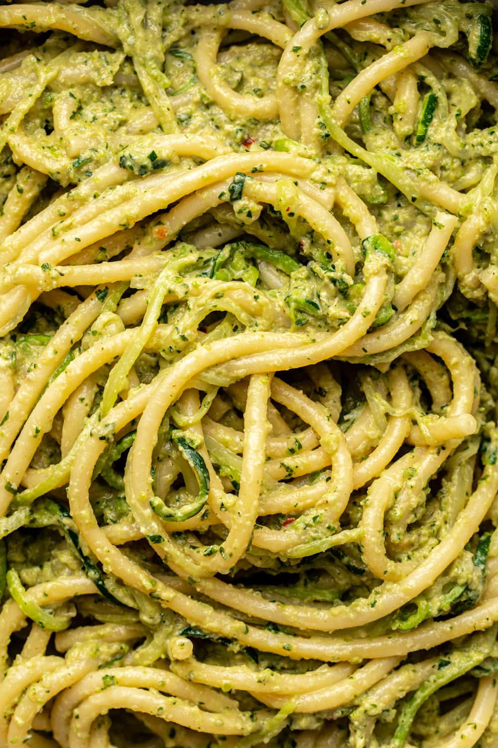 - Zucchini: you need two medium-sized zucchinis. One is shredded and boiled with the pasta, and the other is shredded, sautéed in oil, and blended into the pesto. If you’d like to give this recipe a bit more substance, run the first zucchini through a spiralizer for a 1:1 combo of cooked noodles and zucchini noodles.