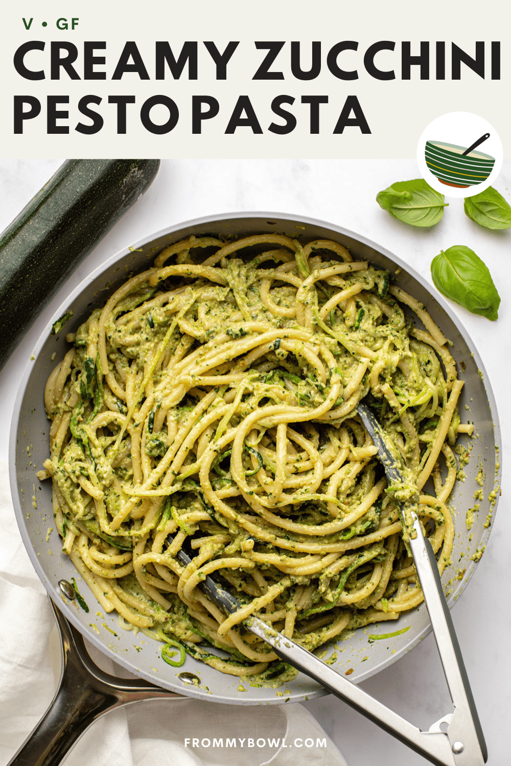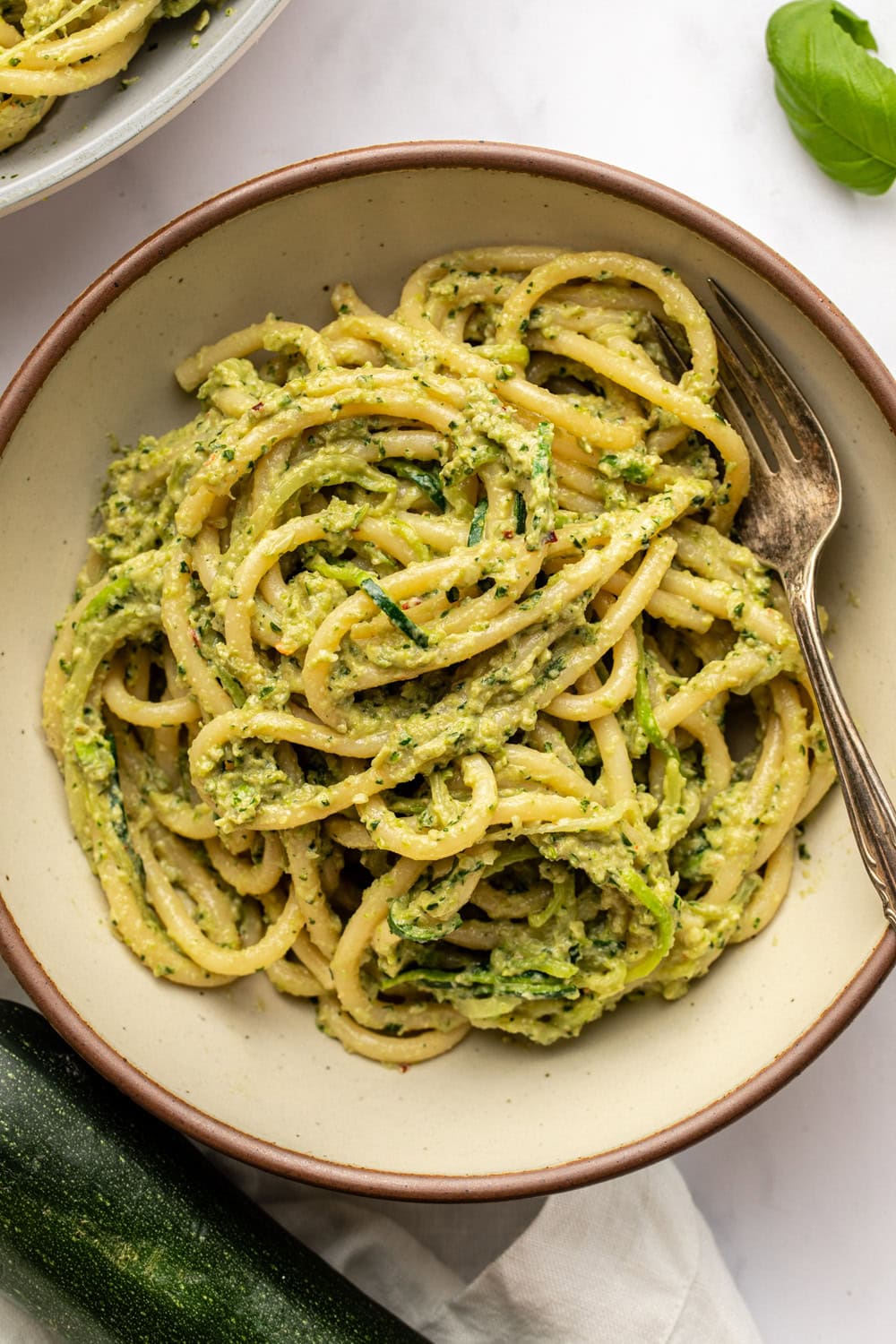 Zucchini is practically bursting out of the farmers’ markets during summer, and there are endless fun ways to enjoy it. When you need a change from roasting it in the oven or firing it on the grill, I’d suggest turning to this recipe. It uses zucchini in two different ways: (1) it’s blended into a fresh batch of zucchini basil pesto sauce, and (2) it’s shredded and blanched alongside boiling pasta noodles, to sneak a little extra veg in there!