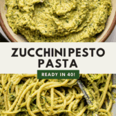 This Zucchini Pesto Pasta tosses al dente pasta and shredded zucchini in a luxurious homemade zucchini basil pesto sauce. It’s an easy way to use up your fresh zucchini and a must-try summer dinner that’s bursting with fresh flavors! Vegan; Gluten-Free and Nut-Free Options.