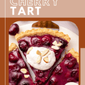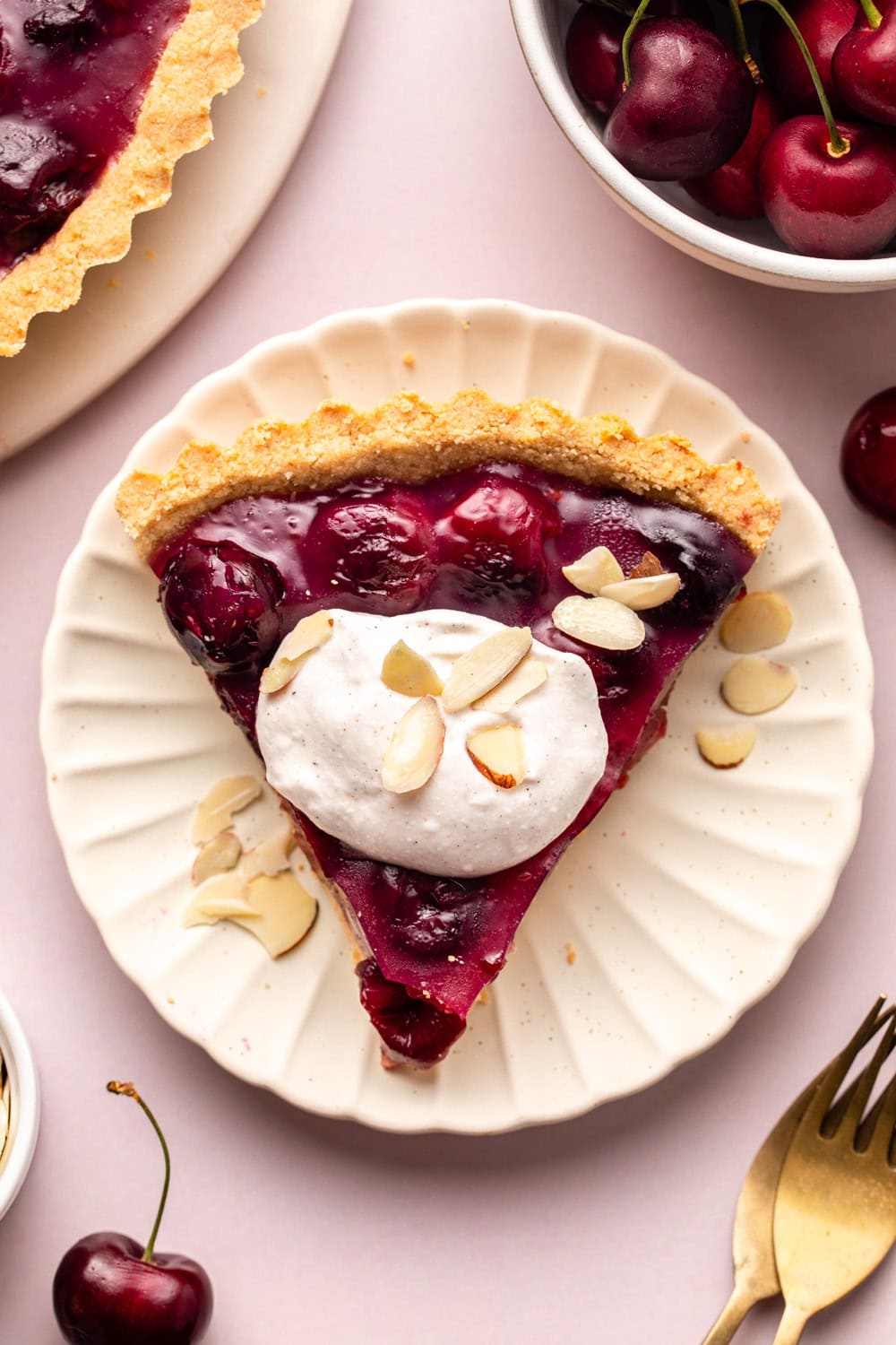 No summer meal is complete without a slice of cherry tart for dessert. Each sweet and sour bite is delicious on its own, but why not kick it up a notch with a few toppings? Slivered almonds, a dollop of vegan whipped cream, a scoop of vegan vanilla ice cream, or a few fresh mint leaves are all great choices.