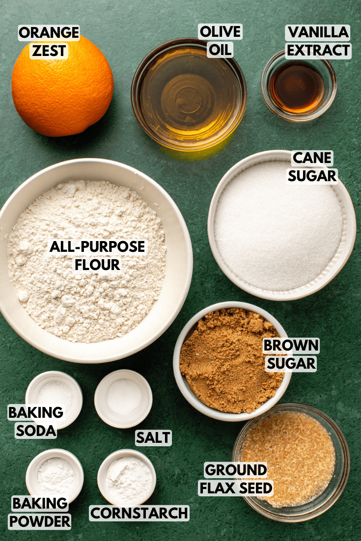 These simple orange cookies call for less than 10 vegan baking staples, plus a good amount of olive oil and fresh orange zest and juice for their signature taste and texture: