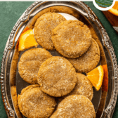 - Form the Cookies: Use a measuring spoon or cookie scoop to scoop out 1 ½ tablespoons of cookie dough. Roll the dough between your hands to form a smooth ball, then generously roll the cookie dough in the orange sugar you set aside earlier. Place the coated ball on the baking sheet and press down slightly to flatten the ball. Repeat with the remaining dough, placing each cookie about 3” apart from each other.