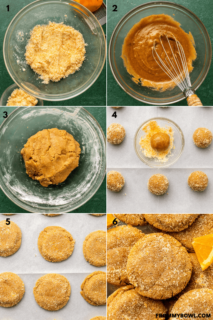 - Wet Ingredients: Add the sugar and orange zest to a large bowl. Use your hands to massage the zest into the sugar until it is evenly distributed and the sugar is yellow (this creates a stronger flavor!). Remove 3 tablespoons of the sugar mix from the bowl and set aside; you will use this to roll the cookies in later. Add the brown sugar, olive oil, flax egg, and vanilla extract to the bowl. Whisk together until evenly combined.