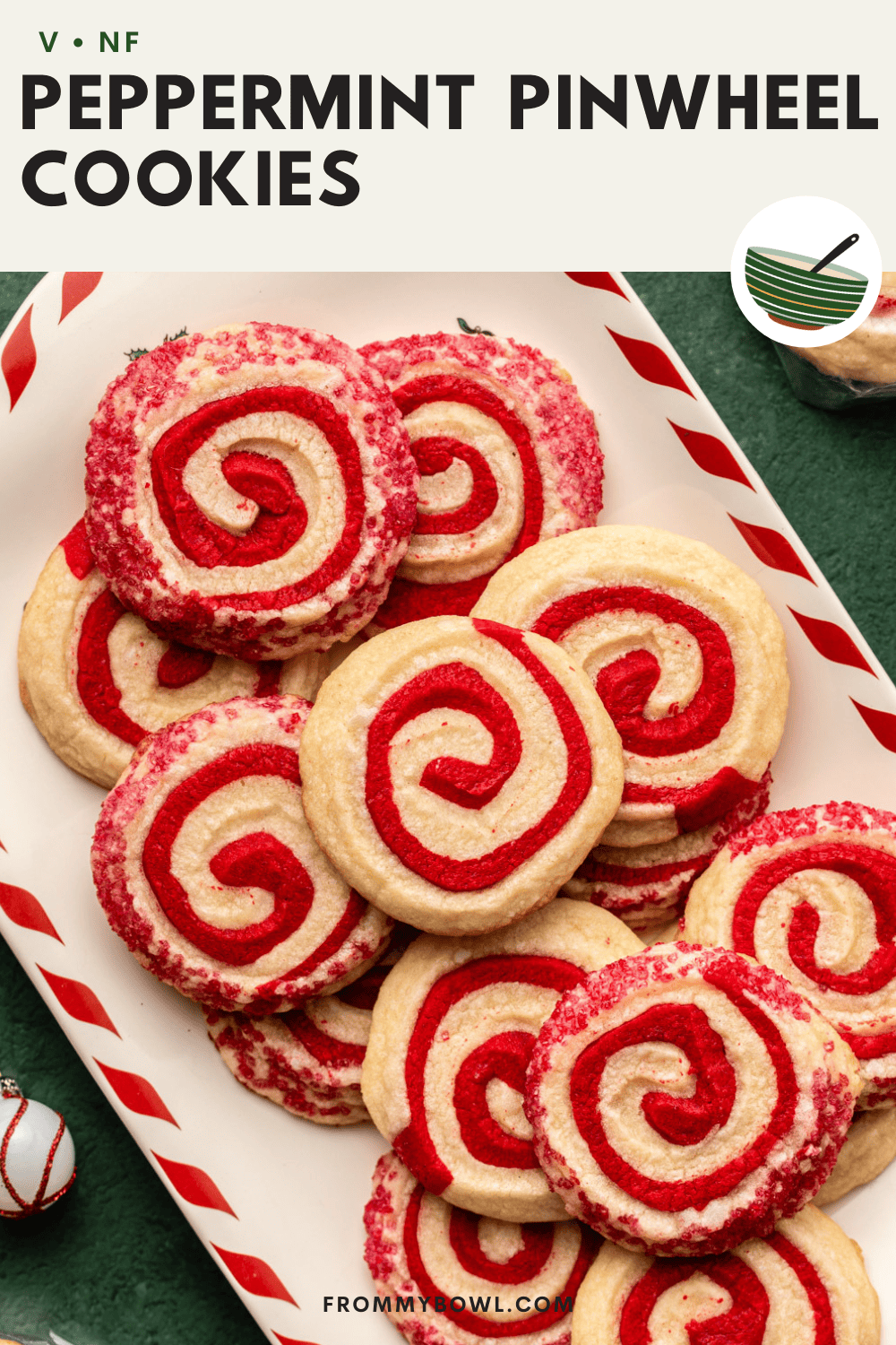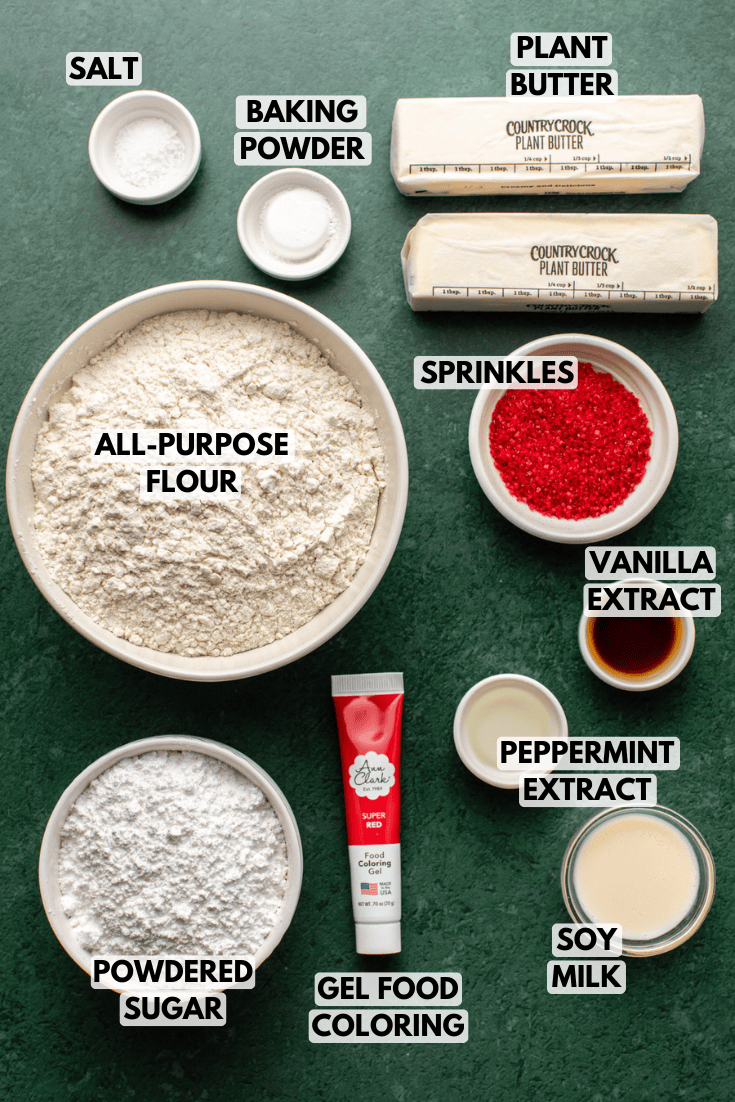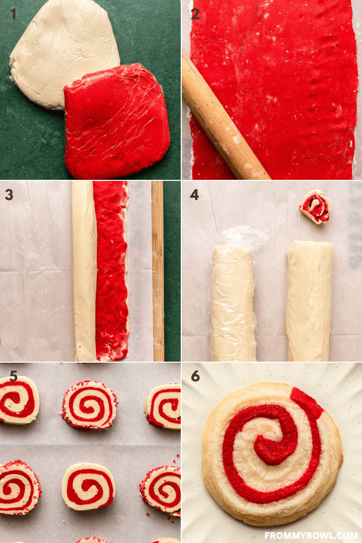 There are no funky ingredients or egg replacers here! Christmas pinwheel cookies are made from nothing but 7 baking staples, plus a couple of extra ingredients that lend a festive color and flavor: