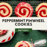 These Peppermint Pinwheel Cookies are just what you need to celebrate the holidays! Layers of red and white shortbread cookie dough are rolled together to create irresistible festive swirls you and your party guests will love. They’re easier to make than they look and require less than 10 baking staples!