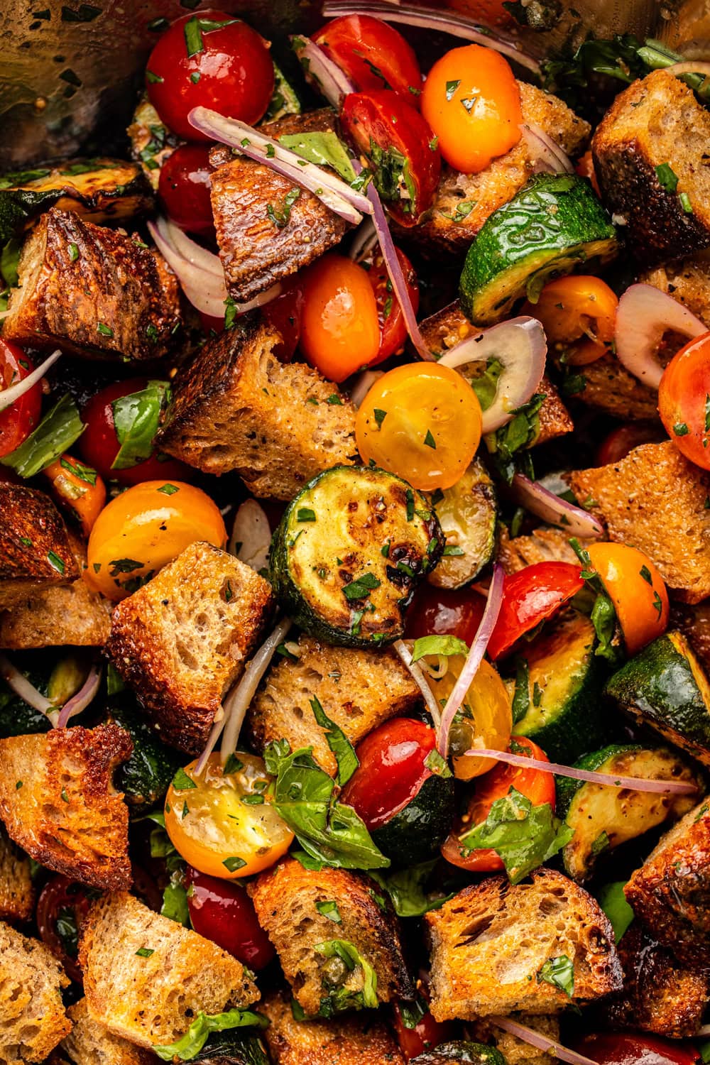 You’ll still find crusty toasted bread and fresh tomatoes in this salad, but to introduce new layers of flavor and texture, I also added tons of fresh herbs and seared zucchini wedges. All tossed in a punchy dressing made from red wine vinegar, olive oil, and the drained tomato juices (AKA liquid umami gold), the hearty, summery goodness in every bite is too good to miss.