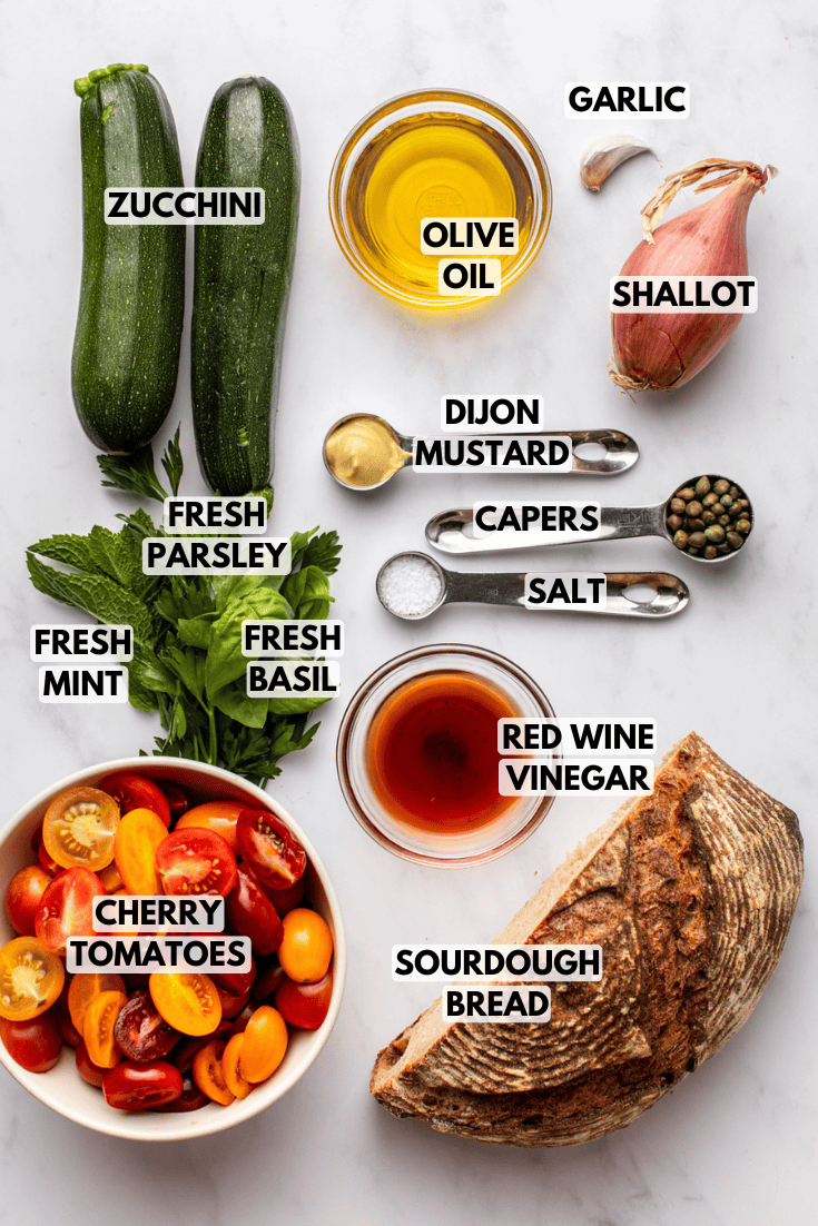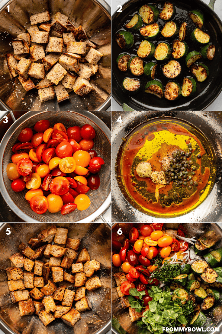 - Assemble: Add the toasted bread to the bowl of dressing first and toss well; this will help rehydrate the bread. Then add the salted tomatoes, seared zucchini, shallot, basil, parsley, and mint to the bowl. Use tongs to toss well, until evenly mixed.