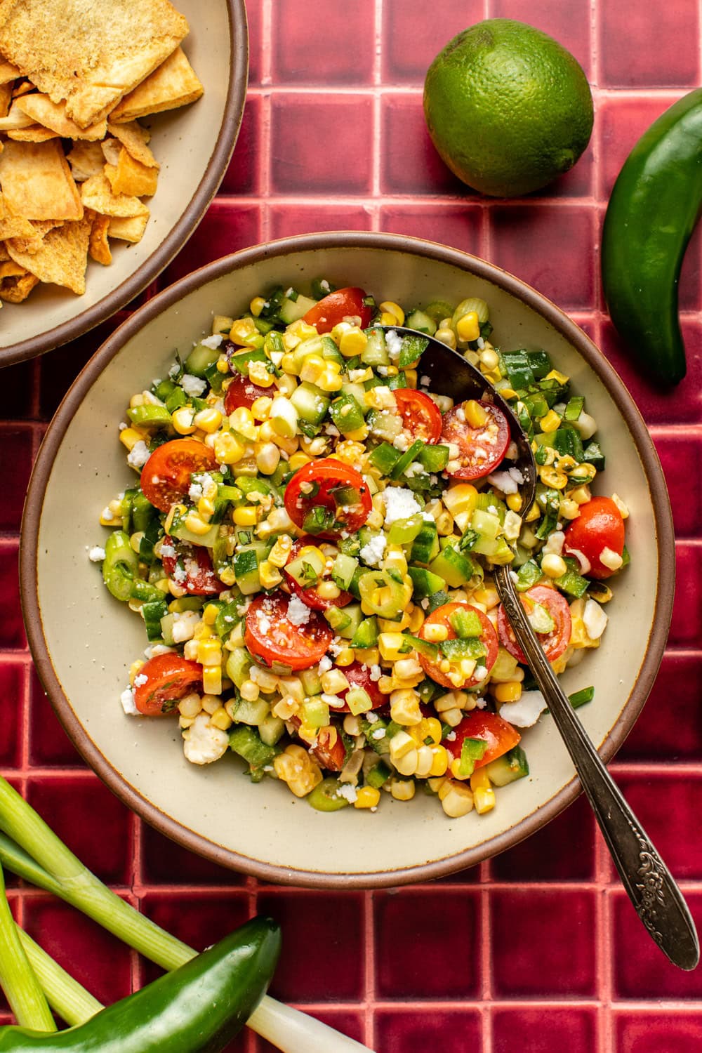 - This corn salad is packed with summer produce and loosely inspired by esquites, a popular Mexican salad Refreshing as a side salad, or serve with chips for a chunky dip! You can even top it with your favorite protein for a light lunch or dinner.