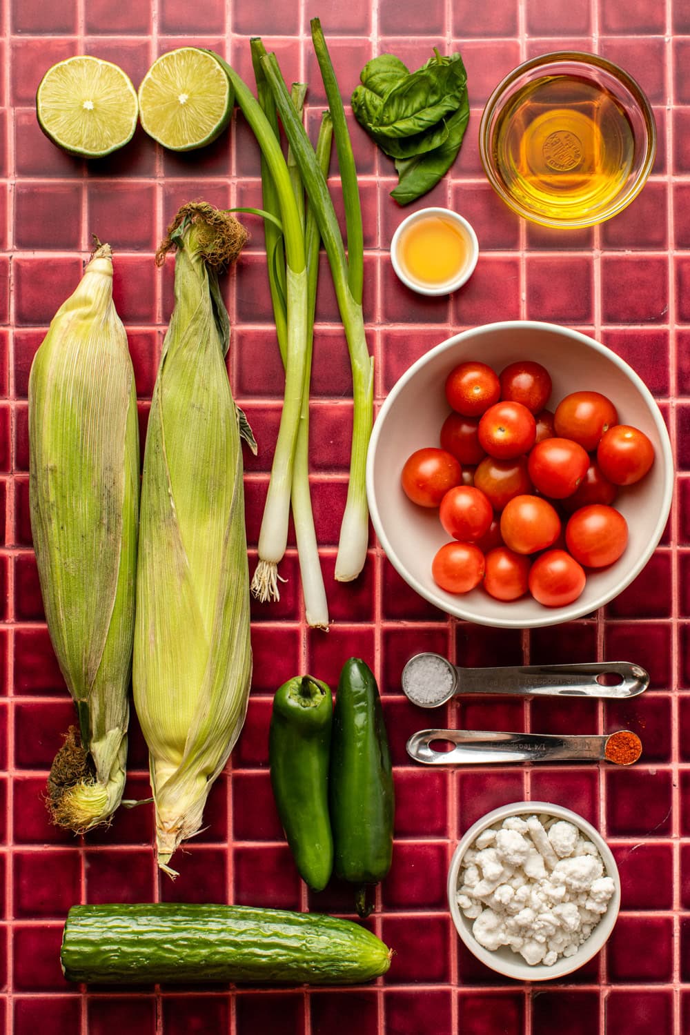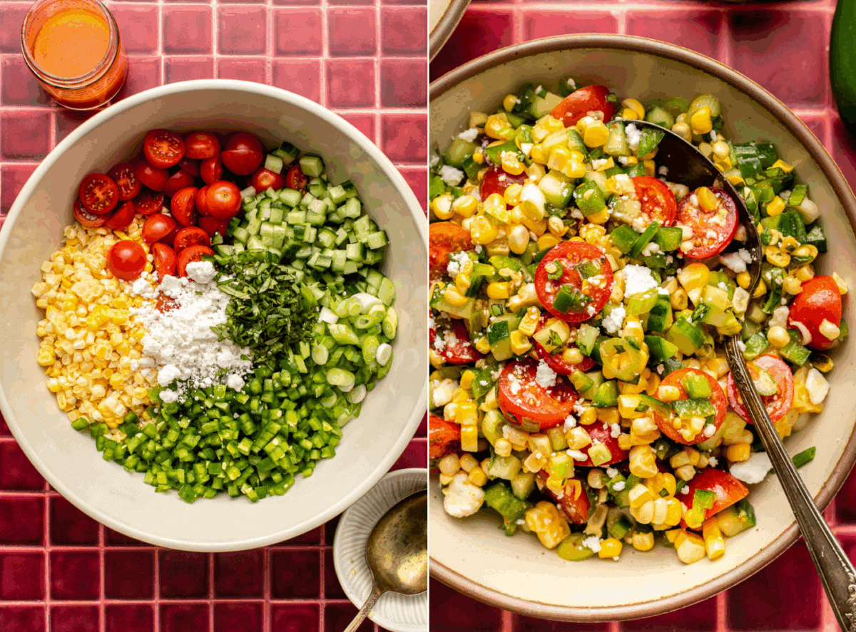 - Add the corn, tomatoes, cucumber, green onion, jalapeños, and feta to a large bowl. Pour the dressing over the salad and toss to combine.