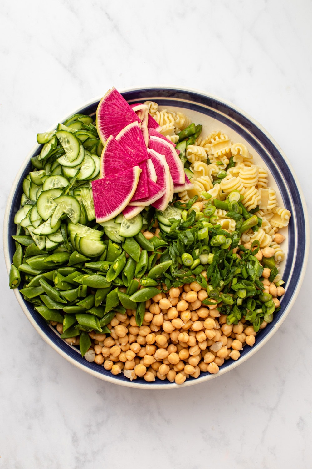 - Add the cooled pasta and asparagus to a large bowl. Combine with the garbanzo beans, snap peas, cucumbers, onions, and radish. Pour the dressing over top and mix until well-coated.
