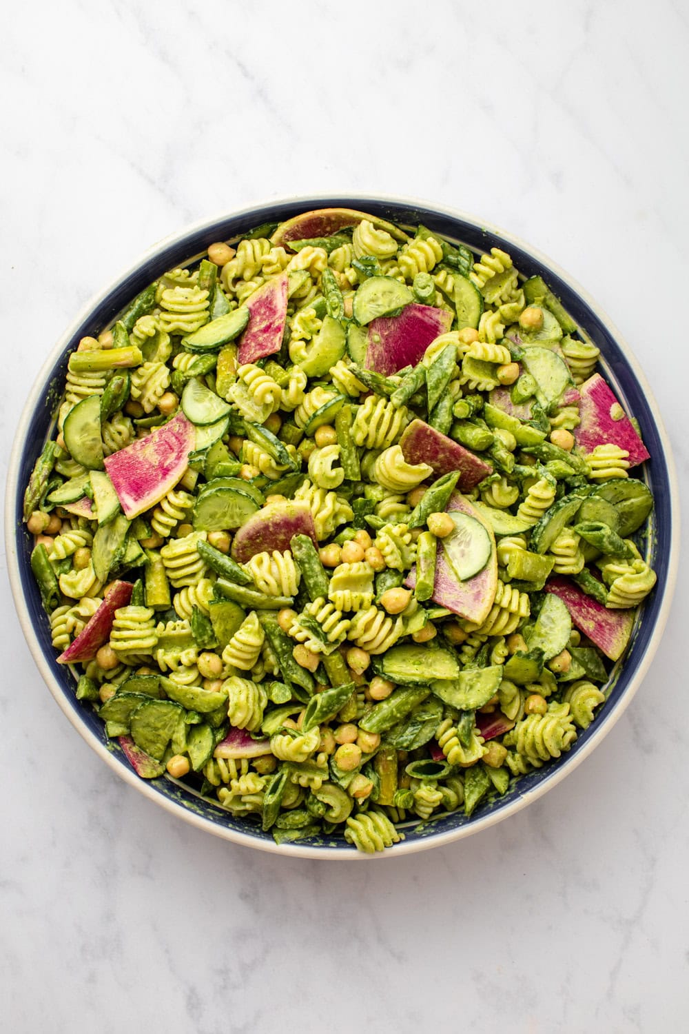 I’ve played around with a lot of vegan pasta salad recipes over the years, all of which you can find on the blog (have you tried this Mediterranean Chickpea Pasta Salad or this Pesto Orzo Salad yet?). This Vegan Green Goddess Pasta Salad, though, is the only one that captures everything that’s great about spring.