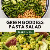 This Green Goddess Pasta Salad puts a fresh and herby spin on a summer favorite! Pasta, seasonal vegetables, and chickpeas are tossed in a creamy vegan green goddess dressing, giving you a refreshing side dish in 45 minutes. Vegan, Gluten-Free Option.