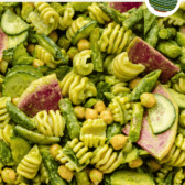 This Green Goddess Pasta Salad is the ultimate side dish to bring to all of your spring and summer get-togethers. Al dente pasta is tossed with blanched asparagus, crunchy and refreshing spring vegetables, and garbanzo beans before being drenched in homemade vegan green goddess dressing. There’s no shortage of addictively delicious flavors in this vibrant spring veggie pasta!