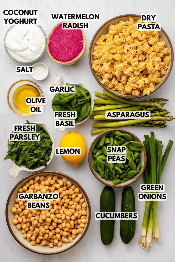 - Crisp Spring Veggies: this spring pasta recipe wouldn’t be complete without a variety of crispy fresh vegetables! Snap peas, green onions, and extra crunchy Persian cucumbers add sweet and earthy flavors, while a pink watermelon radish lends a gorgeous pop of color. Can’t find watermelon radish? Use red radishes instead.