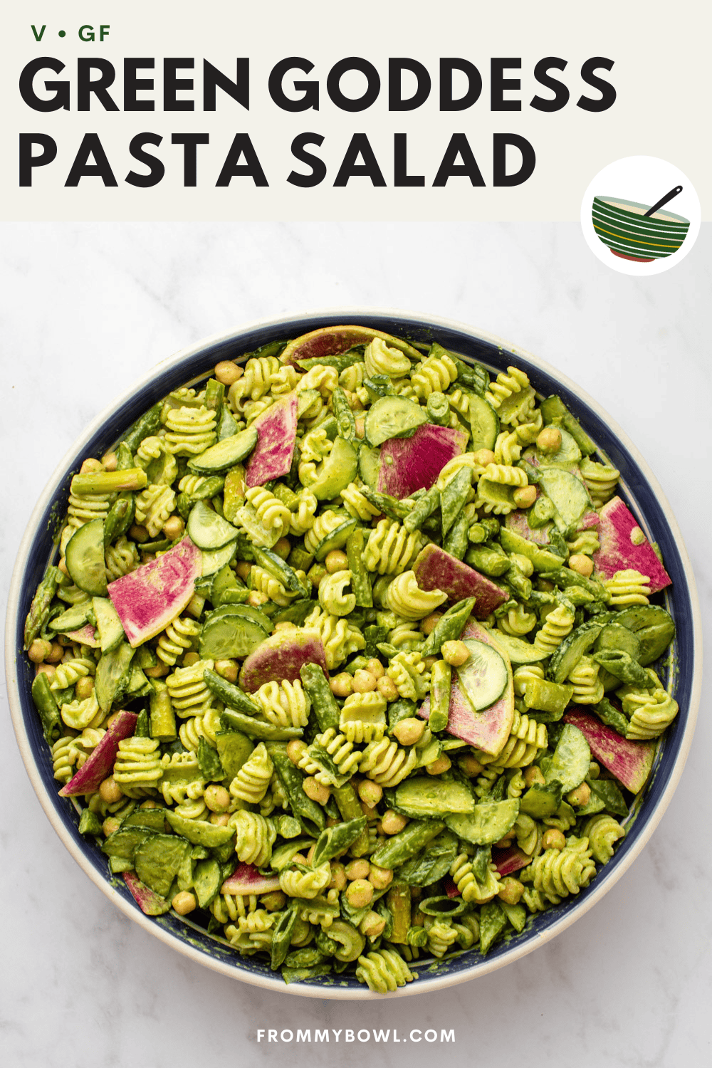 - Green Goddess Dressing: the star of this pasta salad recipe is the homemade green goddess dressing. My vegan-friendly version of this classic herby dressing uses coconut yogurt and olive oil as the base and lots of fresh herbs, garlic, green onions, and lemon juice to give it its signature savory, herby zing.