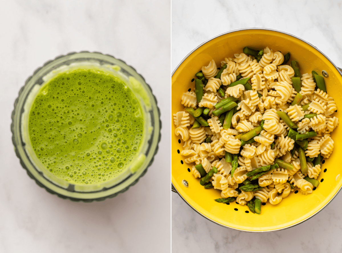 - Cook the Pasta: Bring a large pot of water to a boil and add the kosher salt. Add the dry pasta and cook until al dente, according to package instructions. Add the chopped asparagus for the final 3 minutes of the pastas cook time. Drain the pasta and asparagus, then rinse with cold water until it comes to room temperature. Set aside.