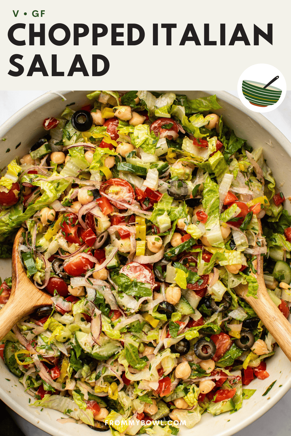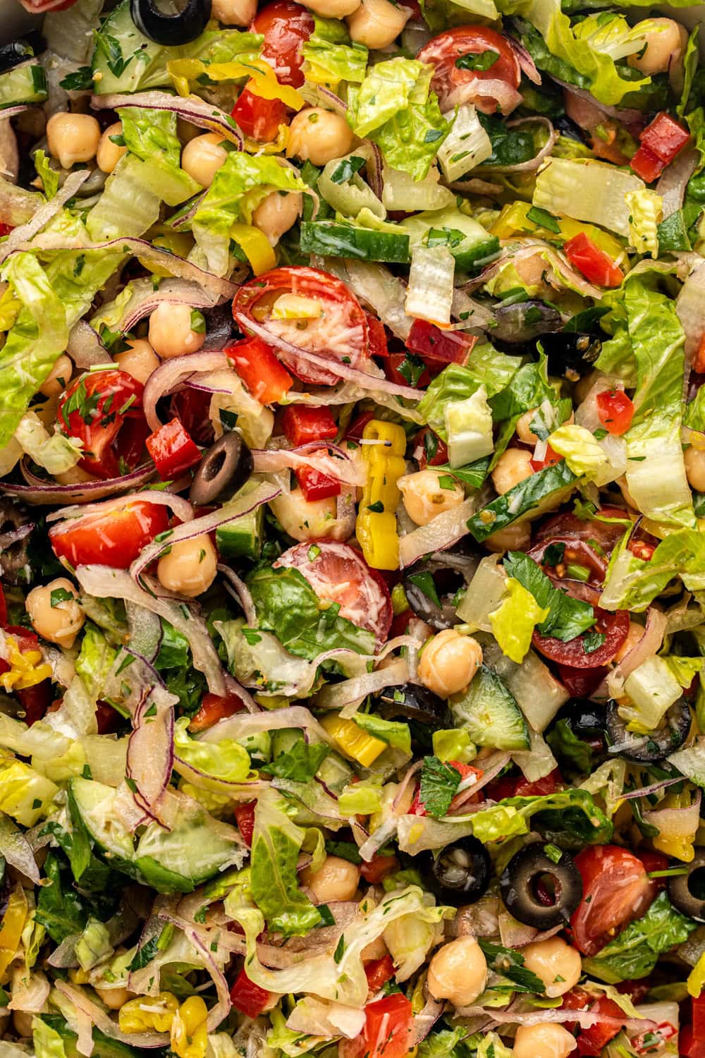 This Chopped Italian Salad is the loaded salad of your dreams, with romaine, chickpeas, fresh veggies, pickled peppers, olives, and vegan Parmesan cheese tossed in a zingy Italian salad dressing. Vegan and Gluten-Free, Oil-Free Option.