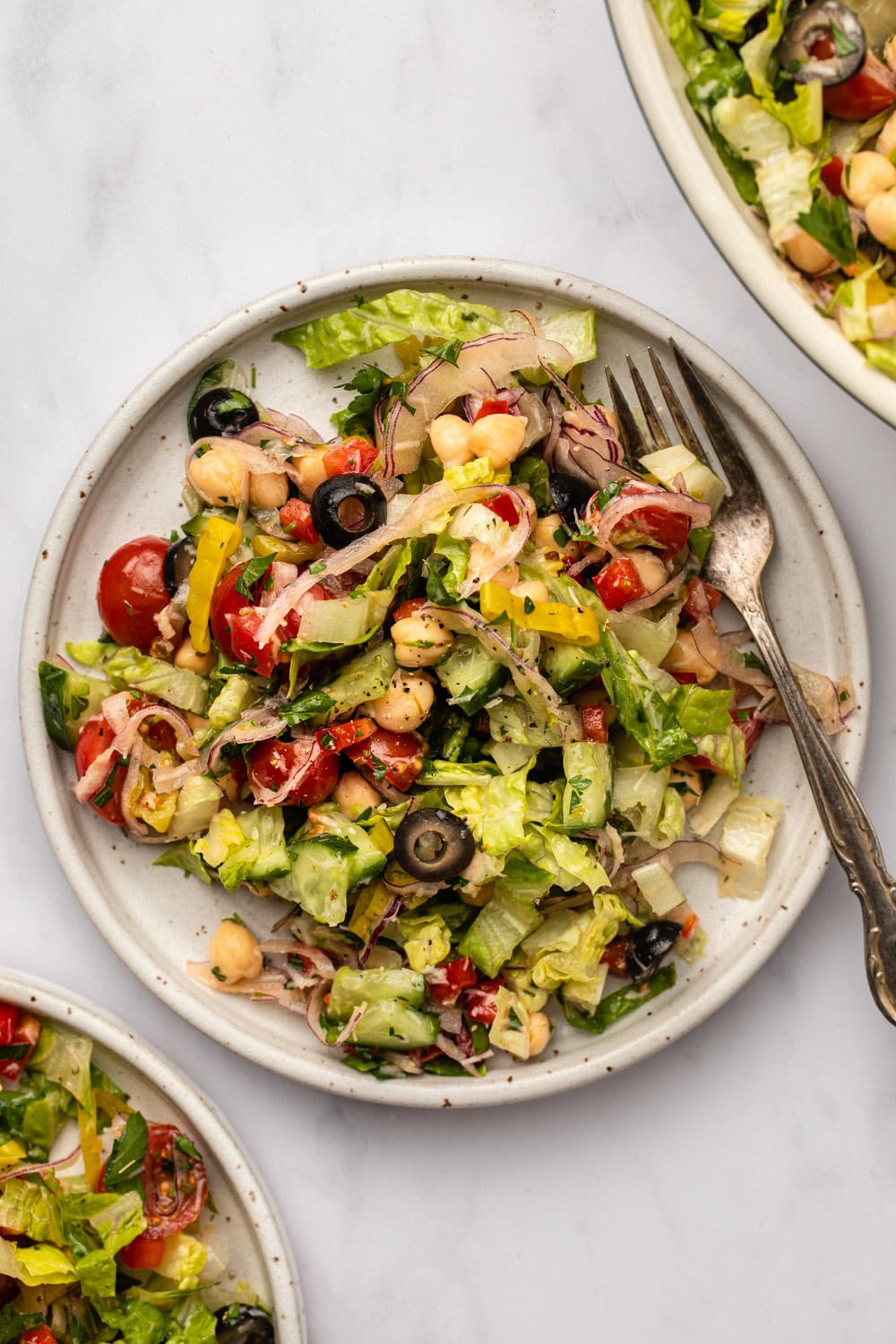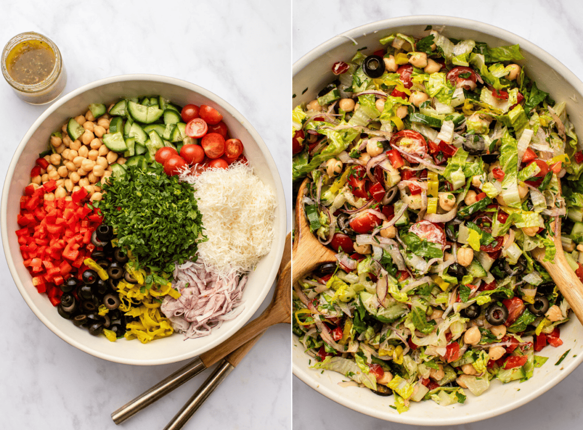 A classic chopped salad recipe is made with almost everything you’d find in an Italian deli. Typically, it tosses finely chopped lettuce, chickpeas, mozzarella, salami, olives, onions, pepperoncini peppers, and tomatoes in an Italian vinaigrette.