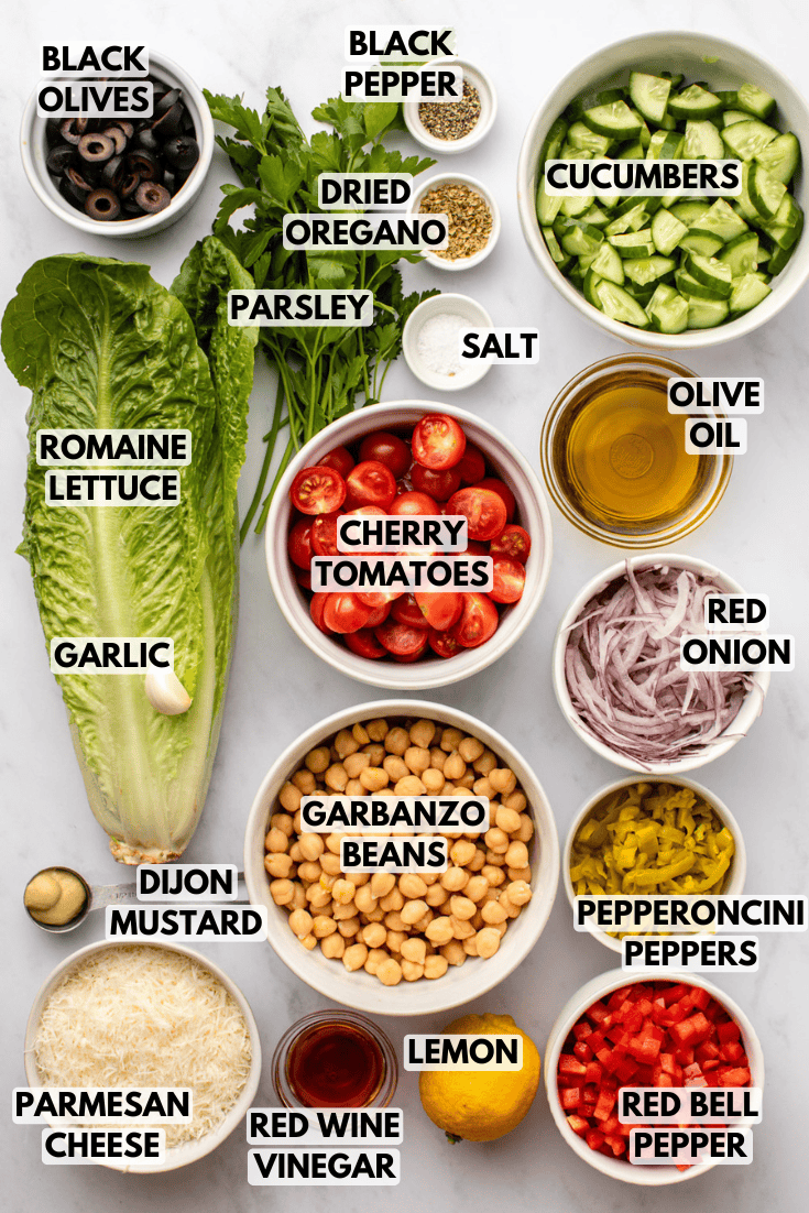 - Add the lettuce, tomatoes, cucumbers, beans, bell pepper, onion, pickled peppers, olives, parsley, and Parmesan to a large bowl.