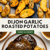 These Dijon Garlic Roasted Potatoes are tossed with a tangy marinade then oven-roasted until tender and crispy. You’ll never want to make boring french fries again! Vegan & Gluten-Free.