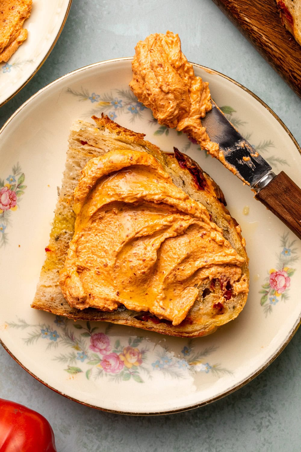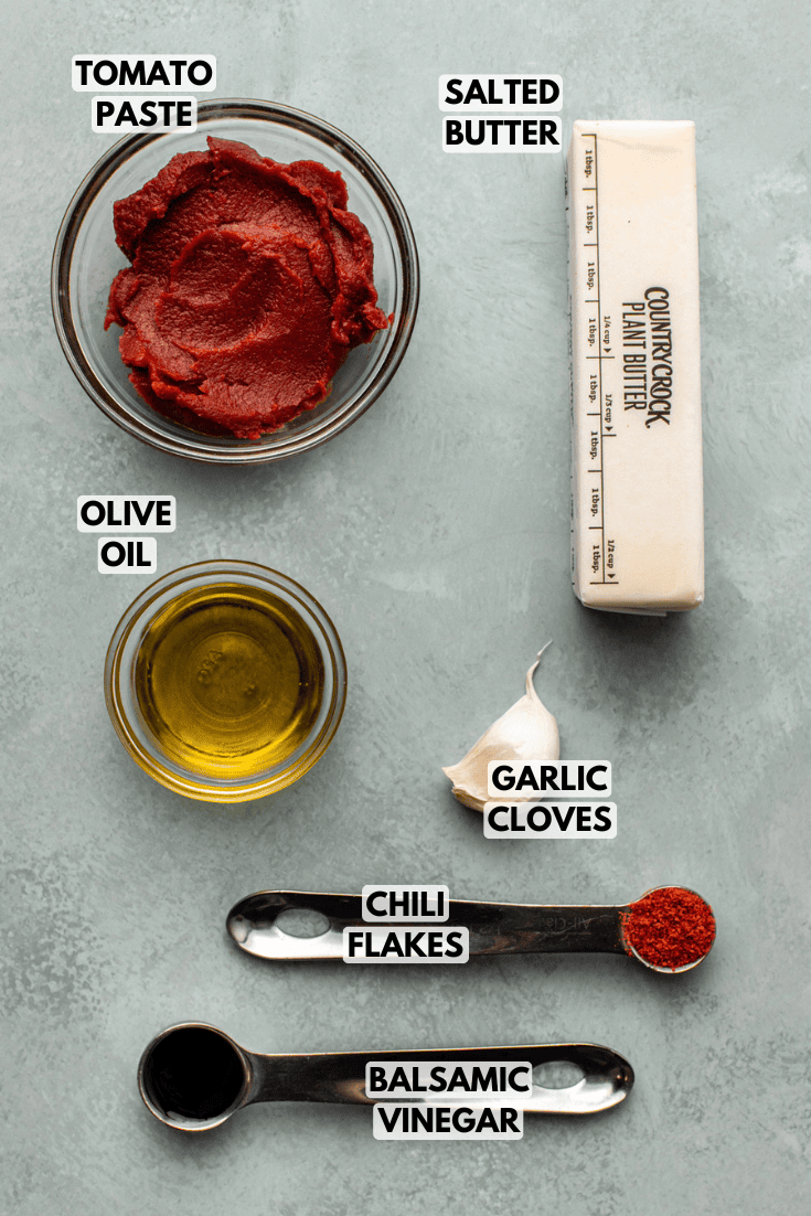 - Butter: the base of the spread is, obviously, made with dairy-free butter. Use good-quality salted vegan butter for the richest flavor and creamiest consistency. If you only have unsalted butter on hand, add 1/4 teaspoon of salt when whisking the tomato paste and butter together.