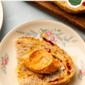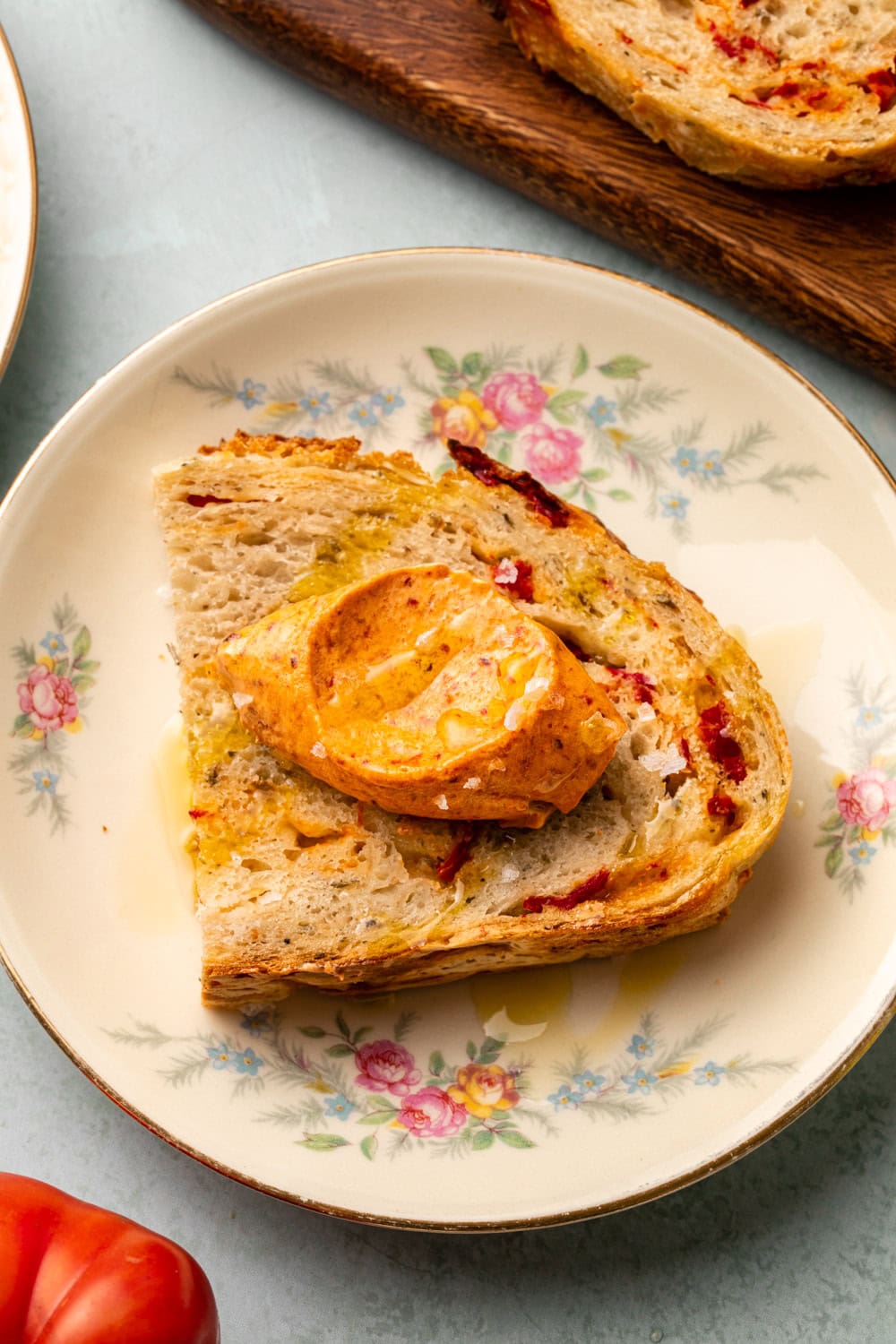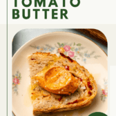 I’m obsessed with spreading this tomato butter on toasted slices of my Sun Dried Tomato Bread. The bread is tender and fluffy, jam-packed with sun dried tomatoes, and bursting with umami, tomatoey flavors. Yum!