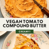Think of this Vegan Tomato Compound Butter as my gift to the tomato lovers of the world. It’s a creamy spread bursting with umami flavors thanks to a fuss-free yet fragrant and savory tomato mixture folded into softened vegan butter. Honestly, it’s so simple and indulgent, you’ll be making it year-round!