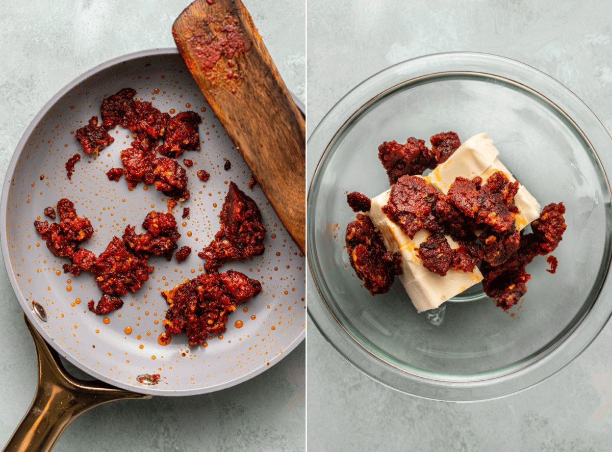 - Combine: Add the warm tomato paste directly to the bowl of butter. Use a fork to mash the tomato paste into the butter and soften it. Once the butter has softened, use a whisk to vigorously mix the butter and tomato paste together until smooth and combined.
