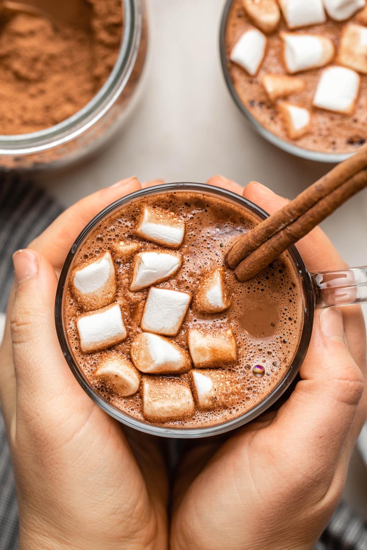 Quite simply, add all ingredients to a high-speed blender, process for 30 seconds, then store in an airtight container! I like to use a high-speed blender with this recipe because it breaks up the sugar crystals and helps to blend them with the cacao powder evenly. You can also just toss everything in a large jar and mix well, but the final mixture won’t be as even and you will have to mix the final cocoa a little more too, to dissolve the sugar crystals.