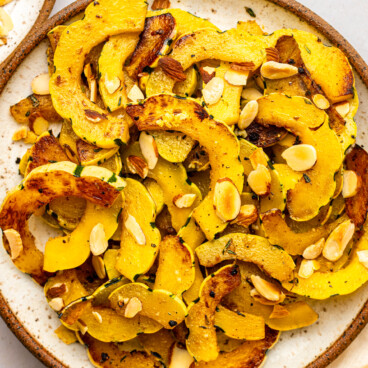 Sautéed Delicata SquashThis Sautéed Delicata Squash is simple, yet packed with fall flavor. Thinly sliced delicata squash infused with herbs and spices, then topped with toasted almonds. Ready in just 25 minutes. Vegan and Gluten-Free.