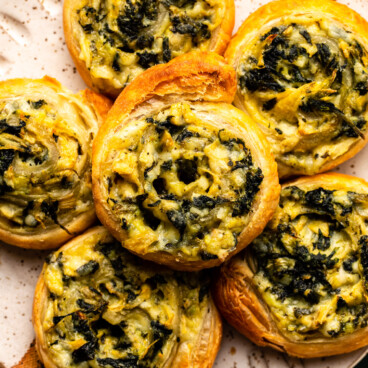 Spinach & Artichoke Puff Pastry PinwheelsSpinach & Artichoke Puff Pastry Pinwheels made with a rich and cheesy filling, frozen spinach, quartered artichoke hearts, and light and flaky puff pastry.