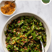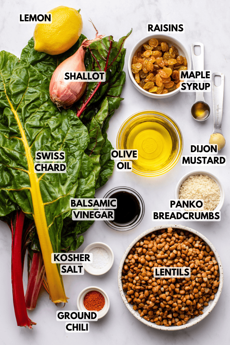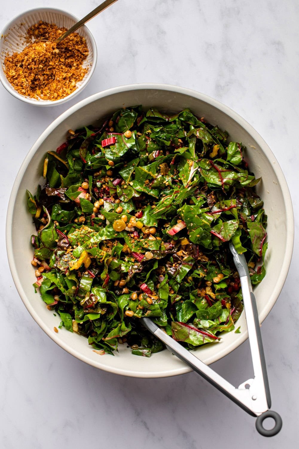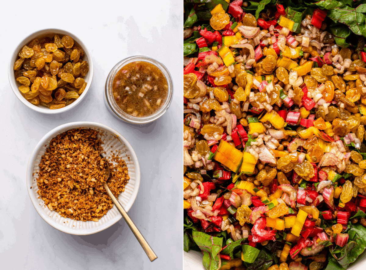 This Swiss Chard Salad tosses hearty Swiss chard, plump raisins, and lentils in a bright lemony dressing. Served with a sprinkle of toasted chili-lemon breadcrumbs for crunch, it’s an over-the-top side dish you’ll love! Vegan, Gluten-Free Option.