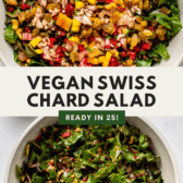Like many of the salad recipes on my blog, this easy Swiss chard salad is a fantastic side dish to serve with all kinds of vegan main dishes. I’d recommend pairing it with other seasonal summer dishes since chard peaks during the warmer months. Indulge in a bowl along with this Roasted Zucchini Sandwich for a hearty lunch; bring it to the barbecue to serve with corn on the cob, baked beans, and these Sweet Potato Black Bean Burgers; or pair it with this Roasted Cherry Tomato Pasta for a simple yet flavor-packed weeknight dinner.
