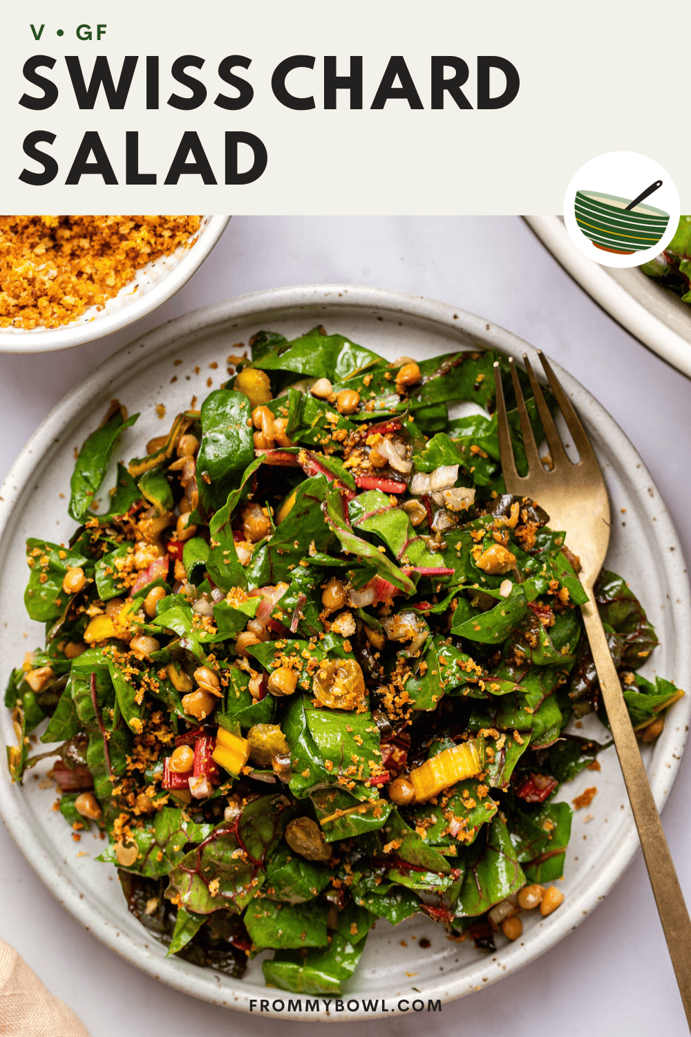 - Swiss Chard: with large, dark green leaves and colorful stalks, Swiss chard is a showstopping leafy green. Their lovely earthy flavor pairs perfectly with the lemon dressing, sweet raisins, and spicy-zesty breadcrumbs. If kale or spinach is your usual go-to leafy green in salads, you’re going to love Swiss chard!