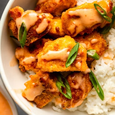 This Bang Bang Tofu recipe features crispy baked tofu drenched in a sweet and spicy bang bang sauce. It’s a fun plant-based appetizer to serve at parties or with rice for dinner! Vegan, Gluten-Free.
