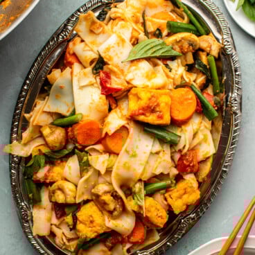 This Thai Curry Noodle dish brings the inspired flavors of Thailand to your home kitchen. Deliciously bouncy noodles tossed in a vibrant yellow curry stir fry sauce and tons of veggies. Vegan, Gluten-Free option.
