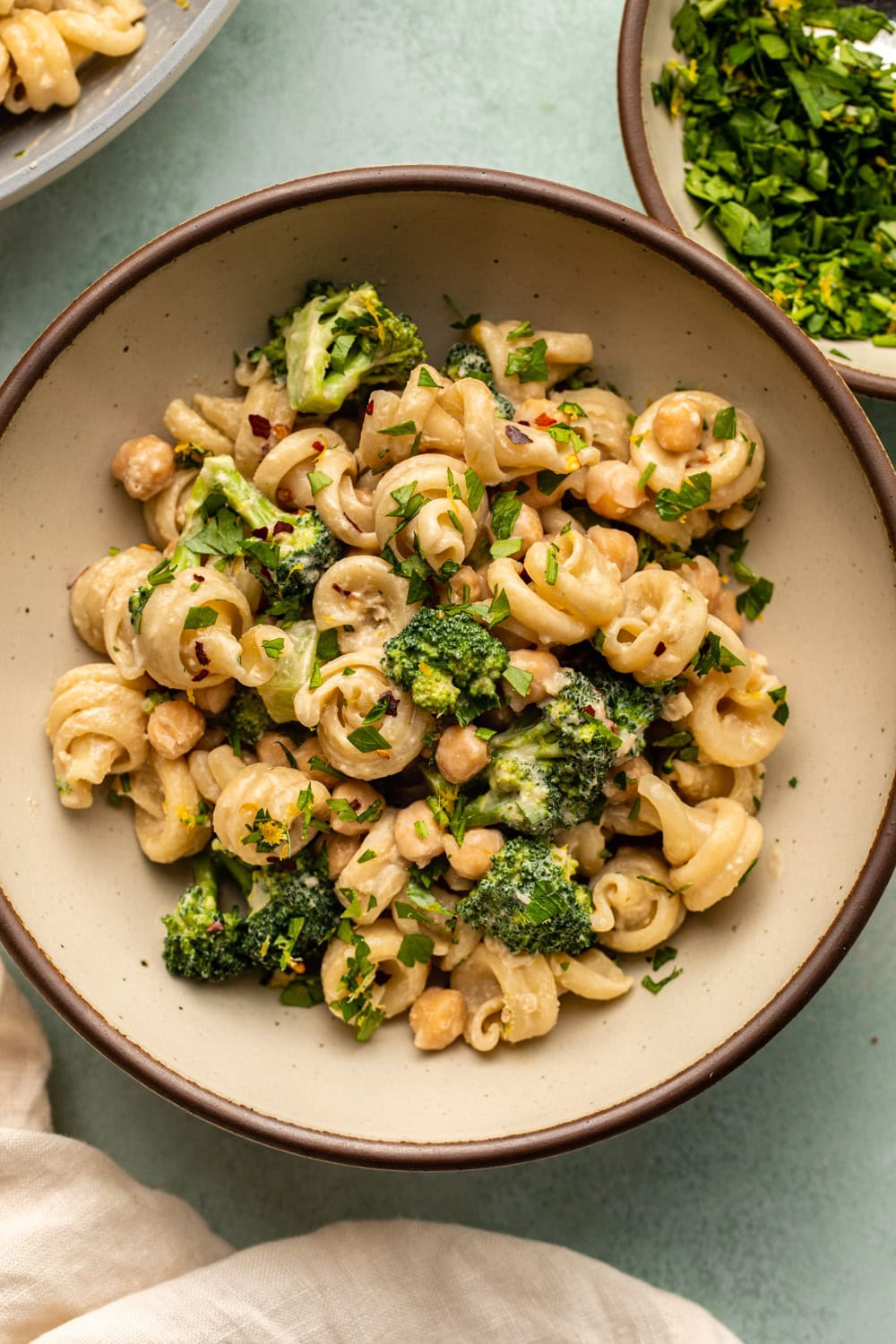 Whether you have plenty of time to cook or you want to get dinner on the table in a hurry, tahini pasta is the answer! It’s pretty filling when served on its own but I personally believe that no pasta dinner is complete without a side of vegan garlic bread or (even better) my Pesto Star Bread. Or, for a full-fledged meal, serve the pasta next to this Everyday Kale Salad or this Everything Bagel Panzanella Salad.