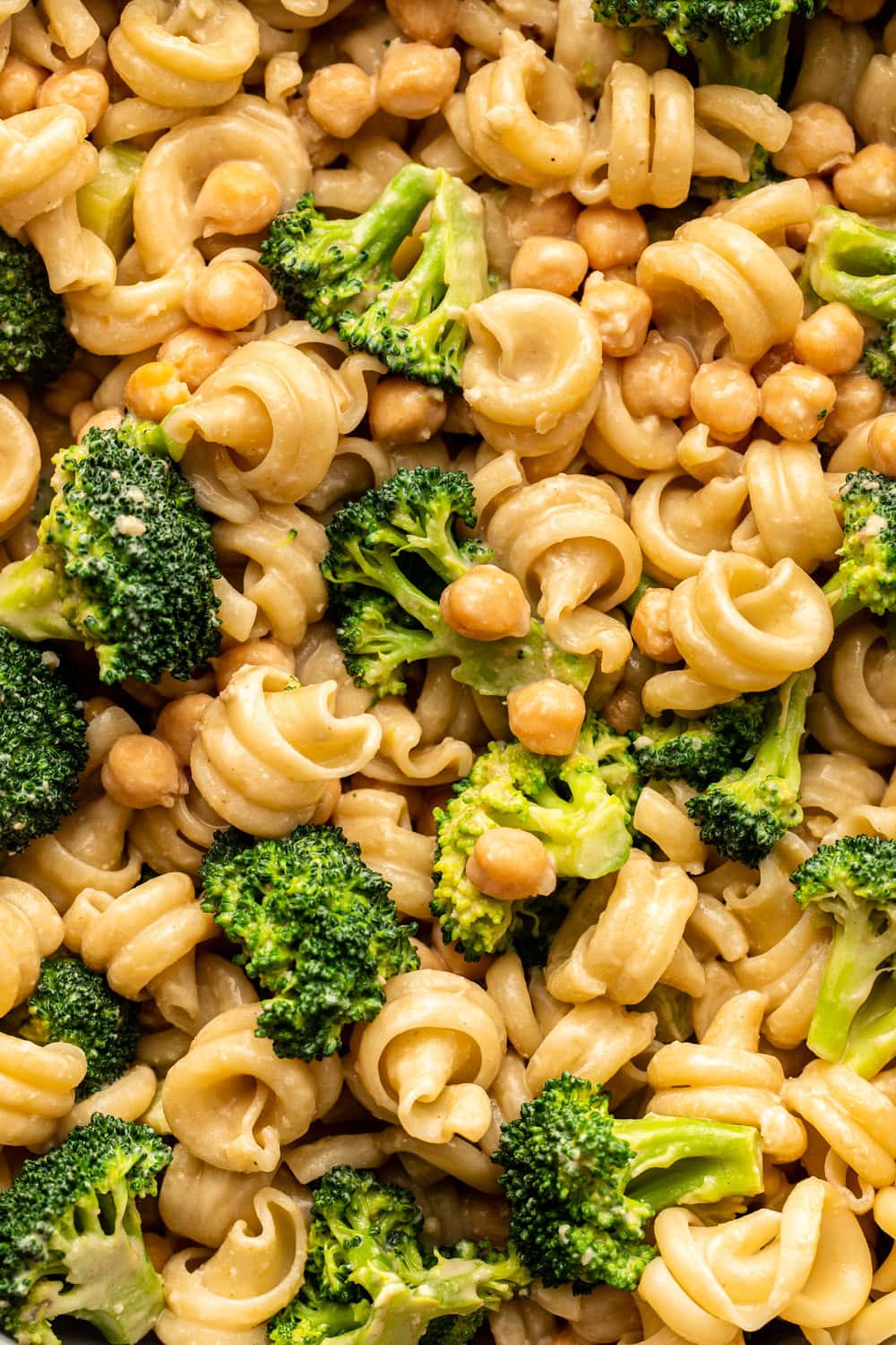 - Combine: Add the pasta, broccoli, and chickpeas to the sauce and mix well. Cook the pasta mixture over the heat only until all ingredients are warm and the sauce has thickened, then remove from the heat.