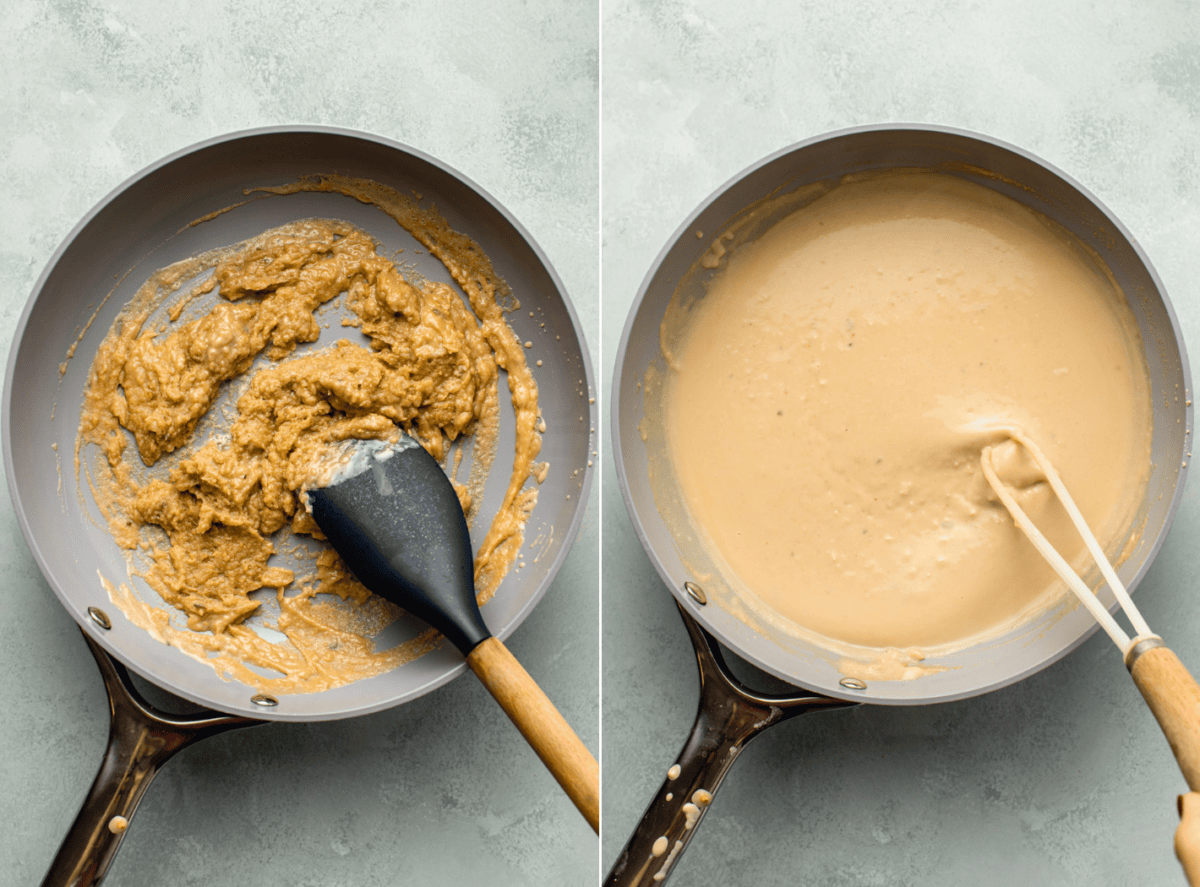 - Tahini Sauce: Add the tahini to the pan and mix well; sauté for about a minute to toast the tahini, then add the miso-lemon mixture. Mix with a whisk; the sauce will immediately thicken and look like it has seized. Begin to slowly add the reserved pasta water in 1/4 cup (60 ml) increments, whisking well and waiting to add more water until the sauce looks smooth and begins to simmer again. Repeat until the sauce has thickened to an Alfredo-sauce consistency. I used only 3/4 cup (180 ml) of water for this, but if your tahini is on the thicker side you may need more water.
