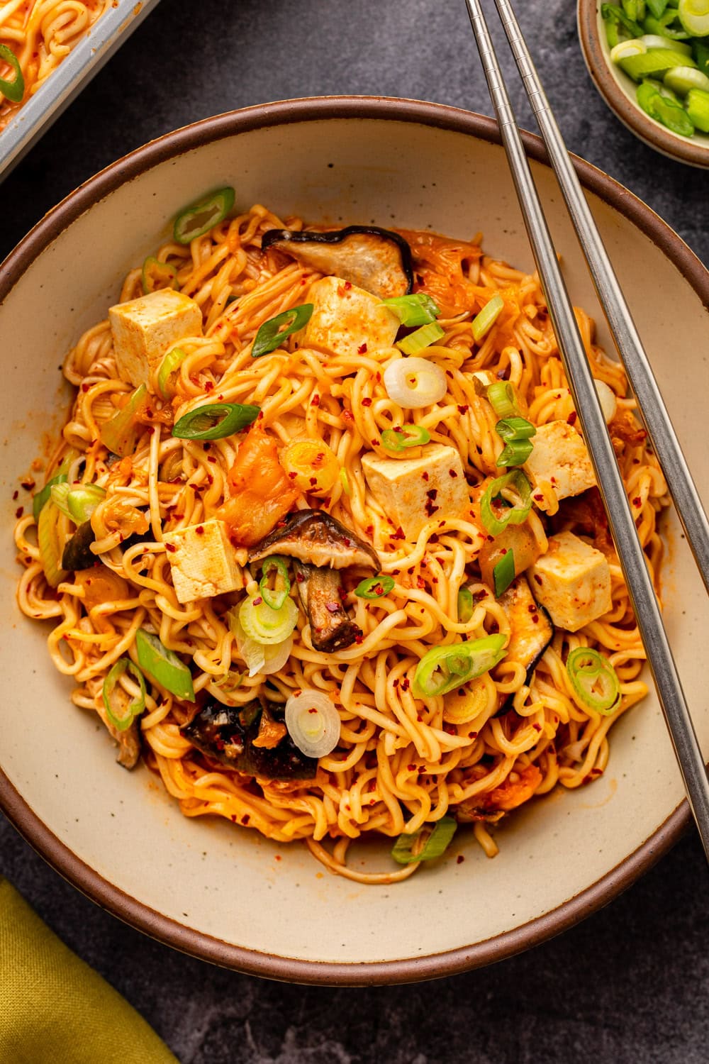 This one-pan Gochujang Ramen Casserole is a deliciously bold and satisfying meal that cooks ramen noodles, tofu, mushrooms, and kimchi in a fiery gochujang miso broth. Vegan, Gluten-Free Option.